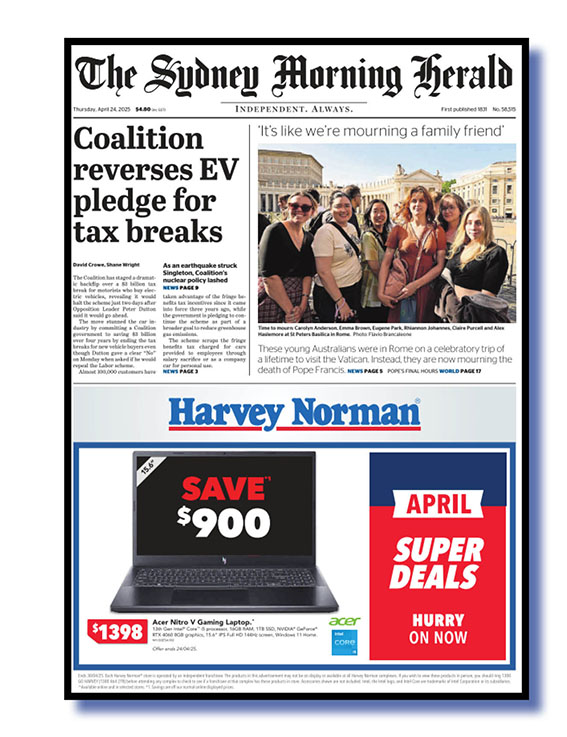 The SMH especially often has an advertising wraparound, and when this happens, the real front page – the one with the half-page ad at the bottom – is often, but not always, folioed as page 1. The inside fake front page, even though it looks more like a real front page than the one on page 1, is called page 3!