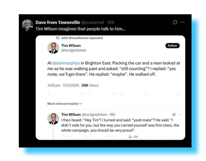 Before we run Xs on Tim, can we just say we’re not 100 per cent sure the X posts attributed to Wilson are genuine, although it certainly looks like something he would do.