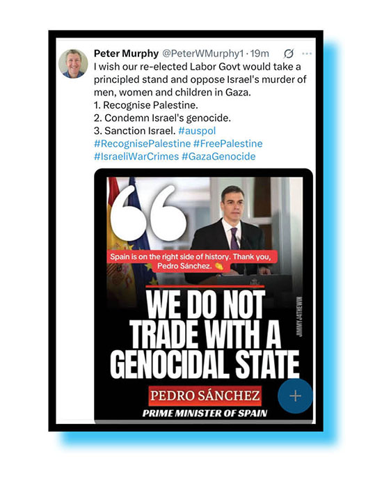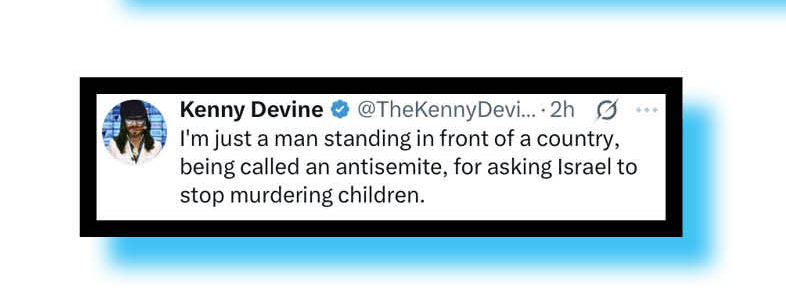 Of course, we suspect the covert message in this short but powerful post is that Kenny Devine dearly wishes that the Australian government might finally show some guts and condemn Israel’s ongoing genocide (our word) that’s worsening by the day. Good luck with that, Kenny!
