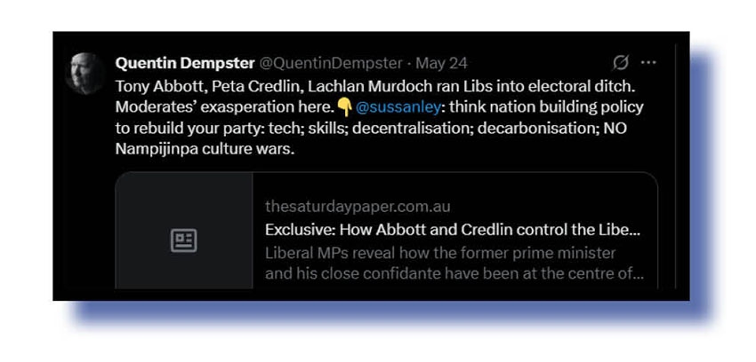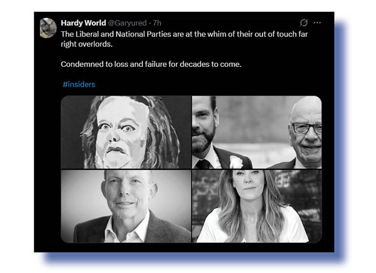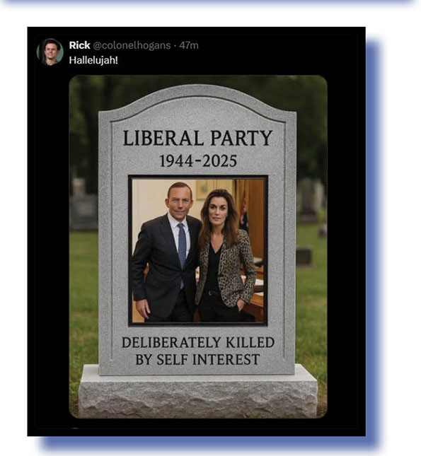 And why does the tombstone above feature both Lurch … sorry, arguably our nation’s finest political strategist who single-handedly made the man beside her who he is today – a fucking laughing stock? And they are front and centre because The Saturday Paper broke the news that Credlin and Abbott now control the Liberals and the crucial part they are playing in making the party of Bob Menzies what it is today… a dying brand in the cities it once dominated.