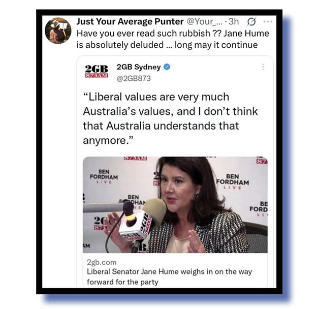 Assuming Jane Hume said these things (and she’s stupid enough to), it’s terribly sad isn’t it? Well, okay, maybe not to those who never thought they’d see the demise of the Liberal Party in their lifetimes and who are now rolling around the floor laughing but if it’s Hume’s way forward, it’s the highway to hell for the only party who could once manage economies well.