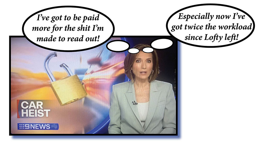 And when Melissa read the lead-in items, there it was: “Fifteen south-east cars stolen in 60 seconds heist!” When the item ran a few minutes later, Melissa dropped the Gone in 60 Seconds! theme and reporter Pat Heagney made no mention of it in his yarn of an overnight weekend theft of all those cars at Willawong near Ipswich.