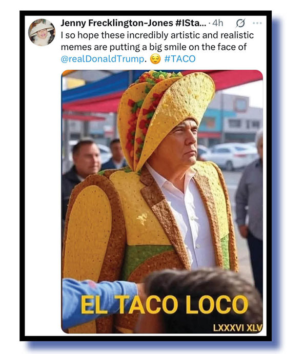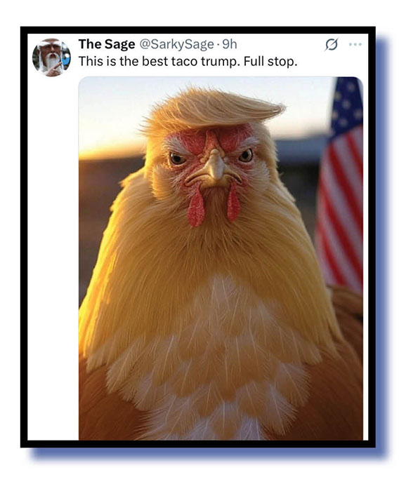Trump first, and apparently he is livid – how could we tell? – over the emergence of #TACOTrump with TACO standing for Trump Always Chickens Out and the avalanche of hurtful memes that followed.
