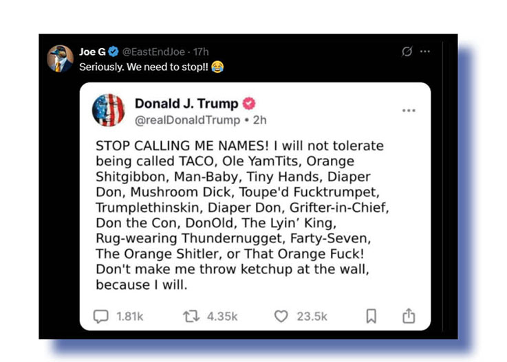 Before we run with some of the others, let’s recap on some of the equally memes, themes and cruel nicknames for our Felon-in-Chief, courtesy of Joe G, highlighting a post we suggest is made up but who cares.