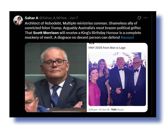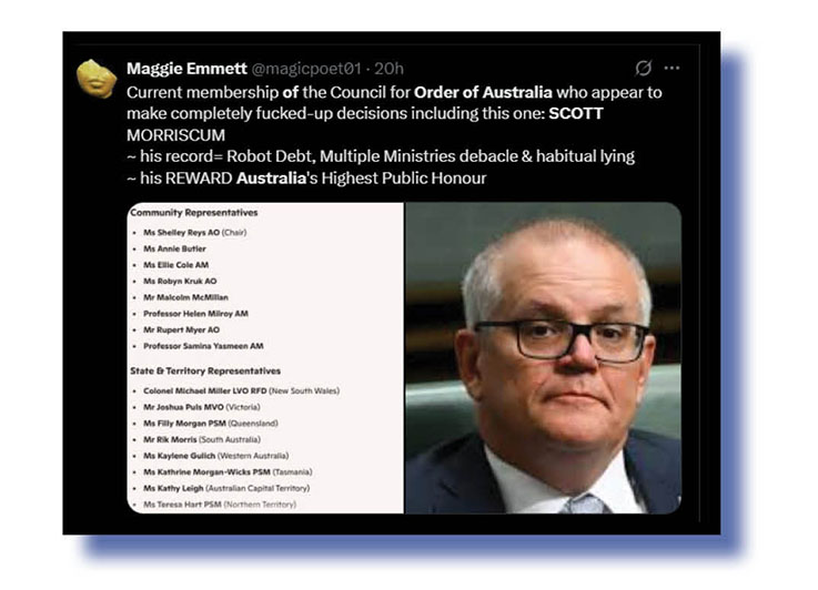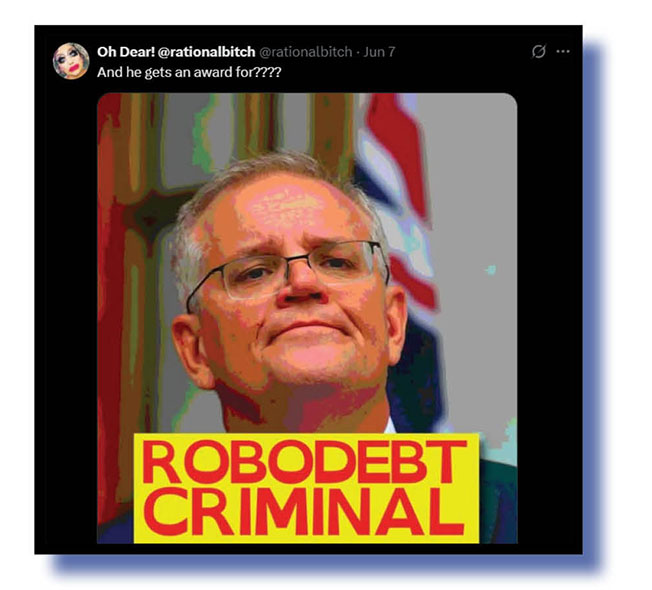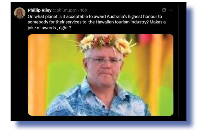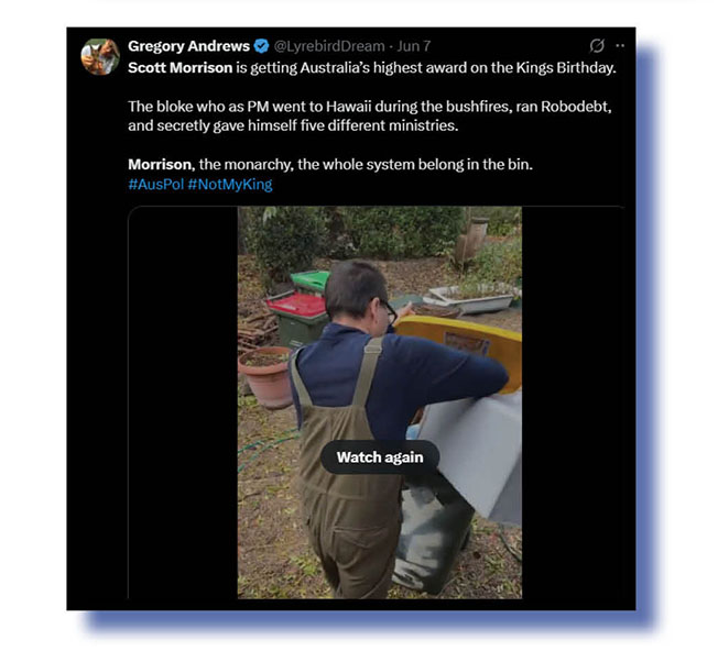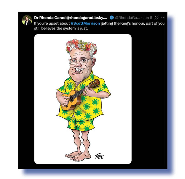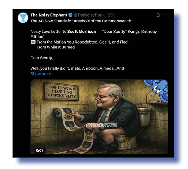 Never let it be said that Australians don’t have a sense of humour! And the latest proof of that? The decision by those who selected today’s King’s Birthday honours to award Scott Morrison our biggest gong for his leadership during Covid plus some other shit!