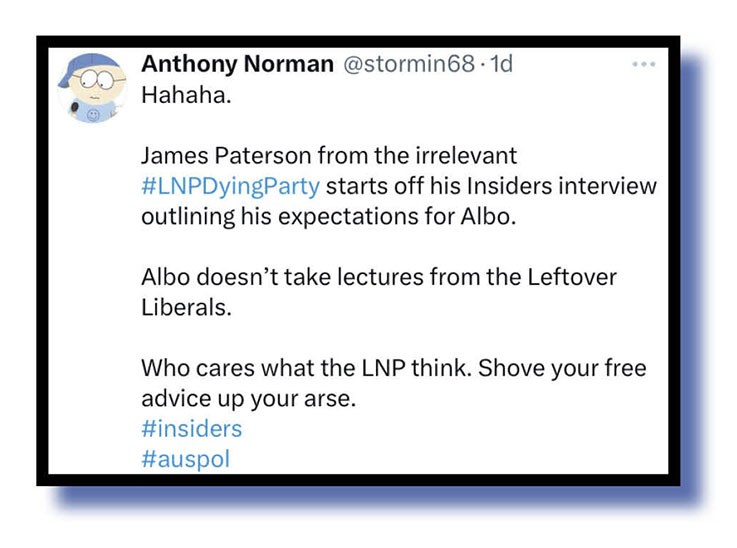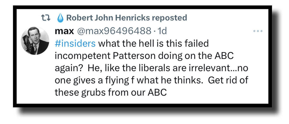 Sorry for the obscenity above but that just about sums up the xcrement that flowed into our putrid prizebarrel late last week after James Paterson featured on the ABC Insiders program.