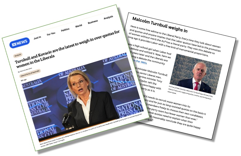 In the Karvelas article Turnbull said: “The Liberal Party has said it needs to recruit more women into its parliamentary ranks for years and for just as long resisted quotas on the basis it undermines the right of party members freely to choose their own candidates.”