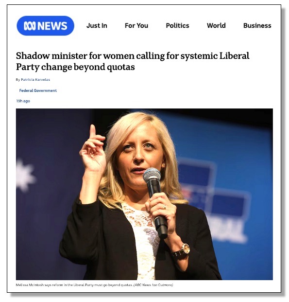 His Lordship went on to conditionally embrace an alternative plan put forward by the federal shadow minister for women, Melissa McIntosh, who has suggested the establishment of a central gender-balanced candidate pool from which candidates for individual electorates could be drawn. (below)