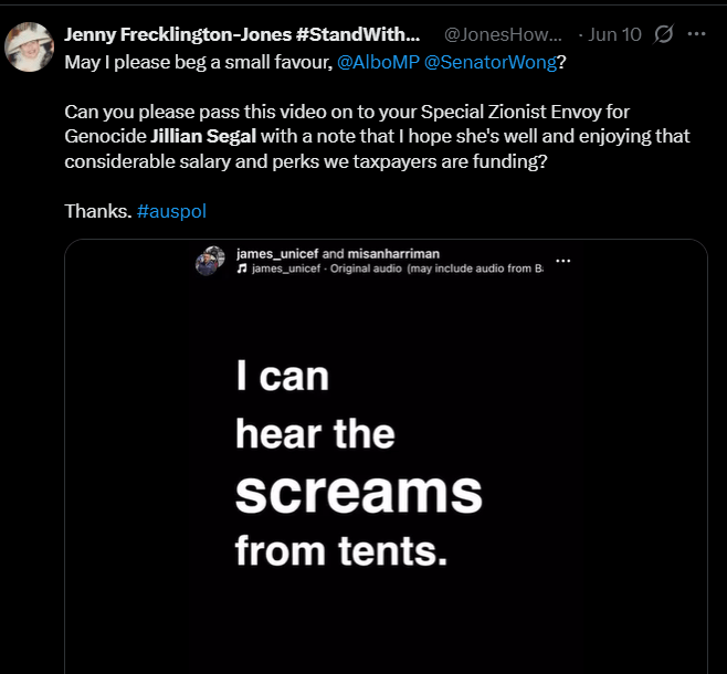 Sorry we can’t do Jenny’s video justice but you can no doubt guess what it contains, seeing it’s happening every day in Gaza. It’s called genocide, Jillian and Anthony.