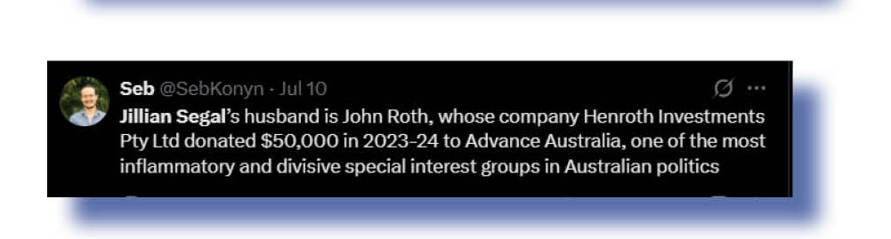 Outraged over the charming Segal and her hubby’s connection to far-right, racist, causes were Ross Clelland, Jenny Frecklington-Jones, Seb, Anthony Clan and Anth.
