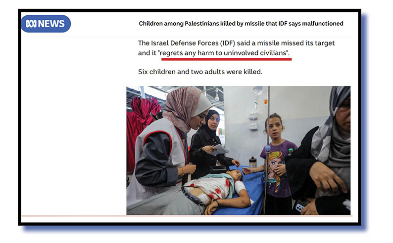There’s more than just one weasel word here, right? There’s regret that the IDF does not in any way harbour, unless there was a larger group of Gazans around the corner their misguided missile could have harmed. And don’t you just love the use of the word “uninvolved”? If you’re lying in a number of body parts in a gutter near a water distribution point in the Nuseirat refugee camp, you’ve been involved.