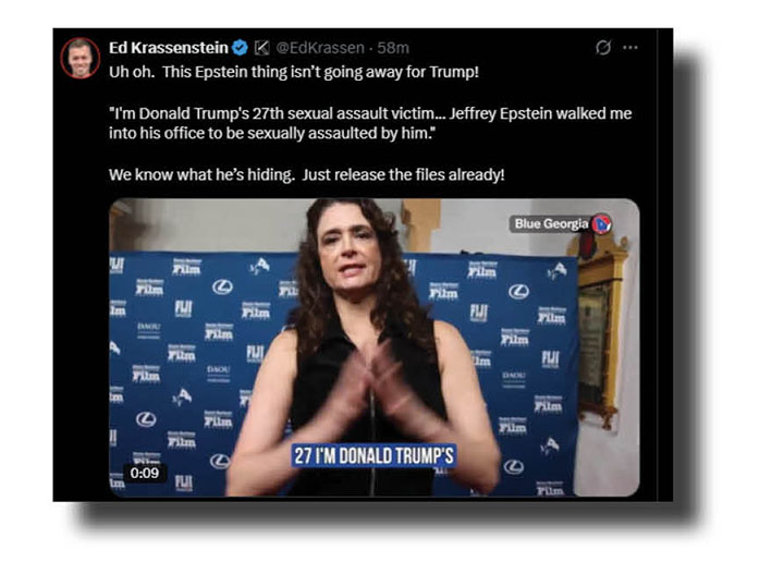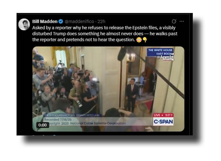 Let’s turn now to the key issue surrounding the six-months mark of Trump’s second term. And it’s the Epstein files/client list and whether Trump has been a paedophile most of his adult life. Take it away, Tennesseine, Dittie, Blue Georgia and Bill Madden.