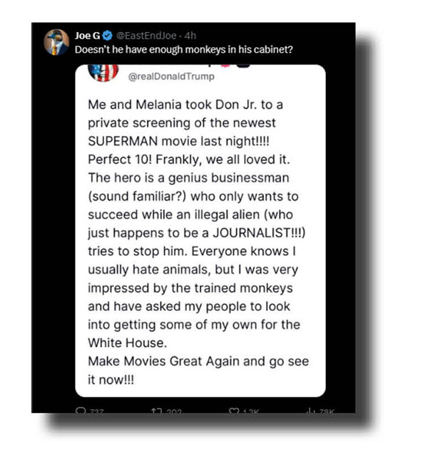 While Mike Carlton clearly diagnosed dementia, Jo read one of the Donald’s Truth Social postings, and perhaps after consulting Doctor Google, saw a terrible case of mental mashed potato, while Joe G went apeshit over Trump’s efforts as a fillum reviewer.