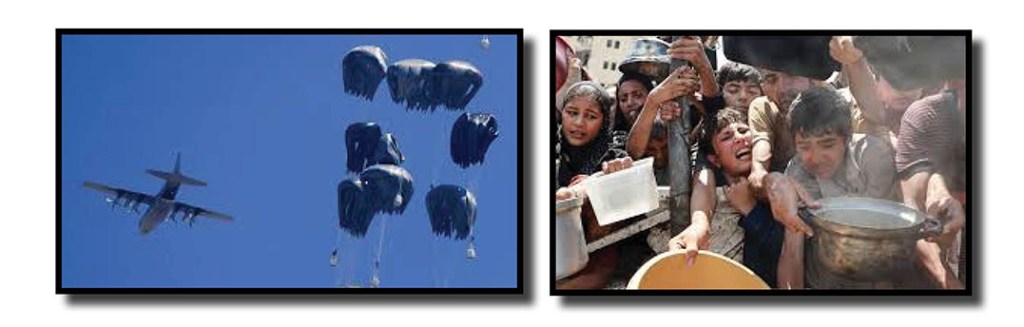 “Oy vey! If they landed on the Gaza Strip itself, several people could be harmed or even killed as these pallets floated down and we’d hate to see that level of death and injury. And, fey!, wouldn’t antisemitic voices around the globe be razed (sic) against us simply for trying, at great cost, mind, to fix alleged widespread starvation that doesn’t exist anyway.