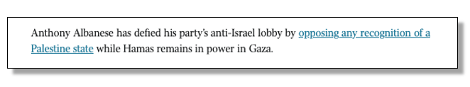 “You see what he did there? Commenting on the PM’s refusal to immediately join what was then just France in recognising a Palestinian state, Stewart said Albo was sensibly – in The Oz‘s eyes of course – defying ‘his party’s anti-Israel lobby’.