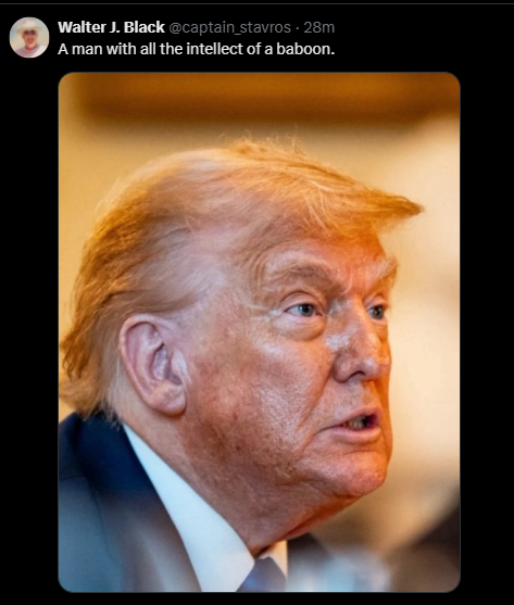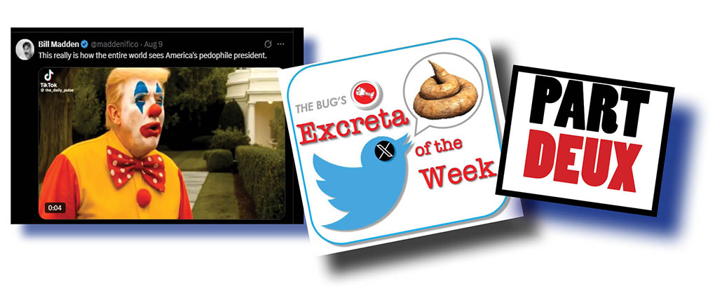 No review of The Bug‘s Xcrements-of-the-Week is really ever complete unless we present examples of the xcrement plopped by some of our favourite Xers on Yam Tits/The Tangarine Shitgibbon/Captain Bone Spurs/Diaper Donnie/The Moron of Mar-a-Lago, etc, etc.