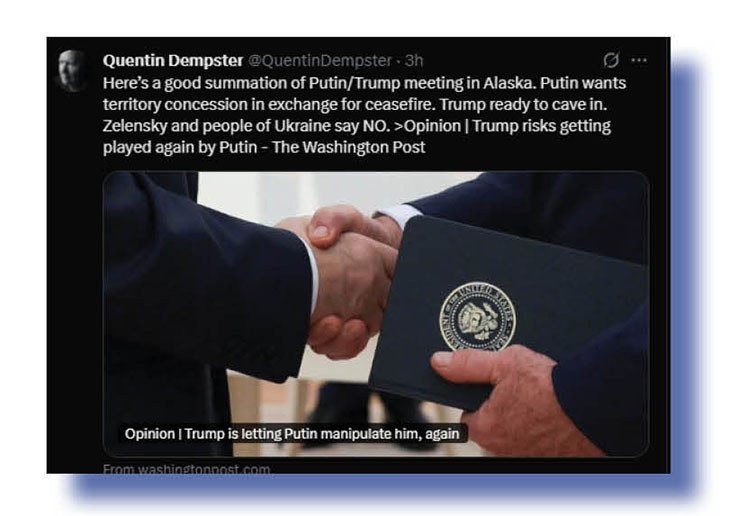 And what a timely second tranche of this column this is, with Trump sacking the Washington DC police department and threatening to do the same thing in other “Blue” cities and twice declaring he’s meeting Putin in Russia; Demented Donald forgetting Alaska is part of the good ol’ USofA.