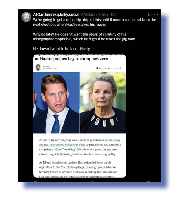 What happened is that we snared a few xcrements around a topic of interest to us generally but haven’t used yet, namely how long Ssussan Ley will last as federal opposition leader?