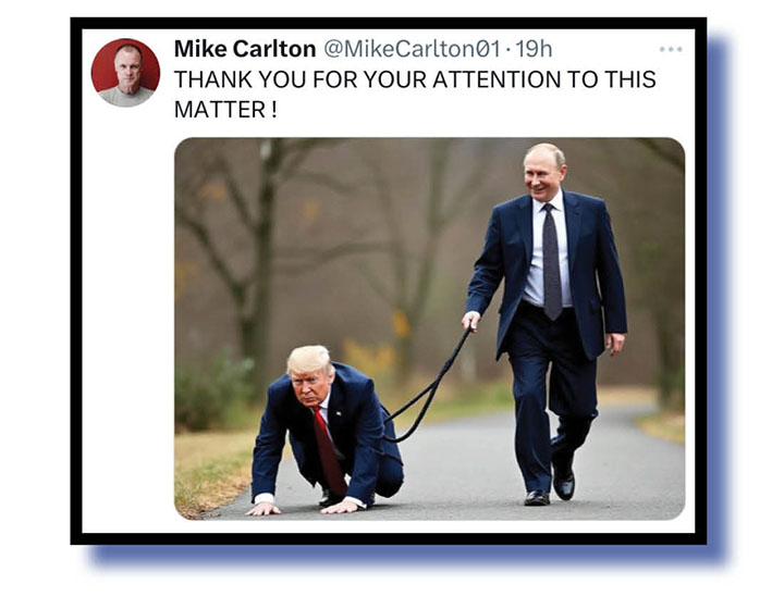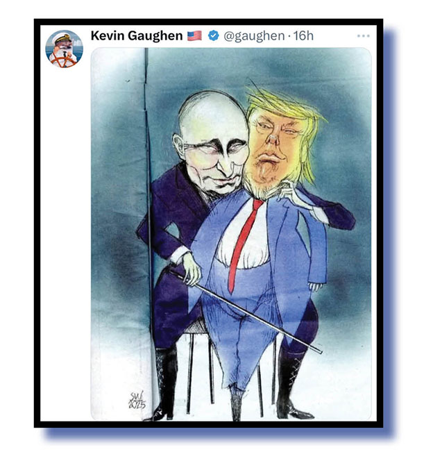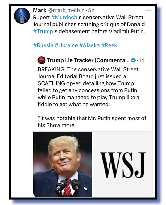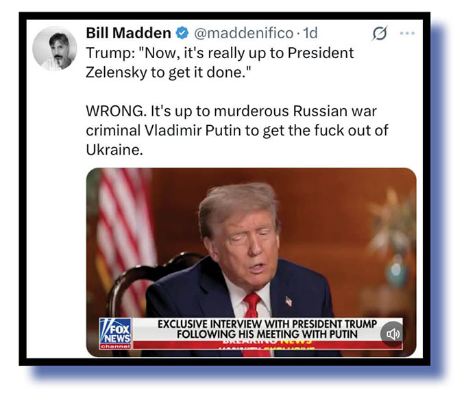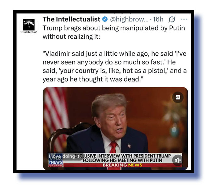 And The Intellectualist and Bill Madden xcreted on Trump’s very sad attempts back home to praise himself by explaining how much Putin admired him and to pass, with nary a blush, the baton to others to end a war he promised to end within 24 hours of his White House return.