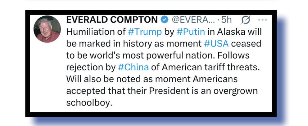 The Bug‘s Xcrements-of-the-Week column today focuses on that highly successful (for Vladamir Putin) and highly unsuccessful (for Donald Trump) meeting of dickheads of state in Alaska on how best to fuck over Ukraine.