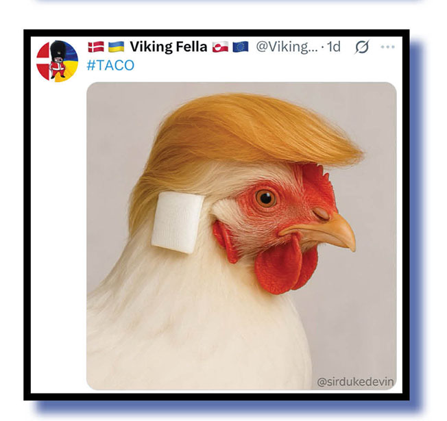 And are you BUGgers out there waiting with bated breath for the crippling sanctions promised by the Tangarine Shitgibbon if Putin didn’t agree to an immediate ceasefire? Viking Fella’s meme suggests you might like to quickly abandon such silly hopes.