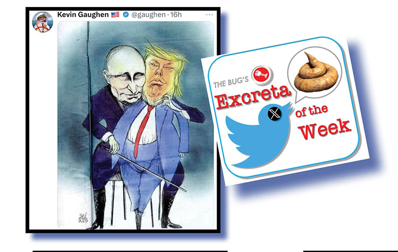 The Bug‘s Xcrements-of-the-Week column today focuses on that highly successful (for Vladamir Putin) and highly unsuccessful (for Donald Trump) meeting of dickheads of state in Alaska on how best to fuck over Ukraine.