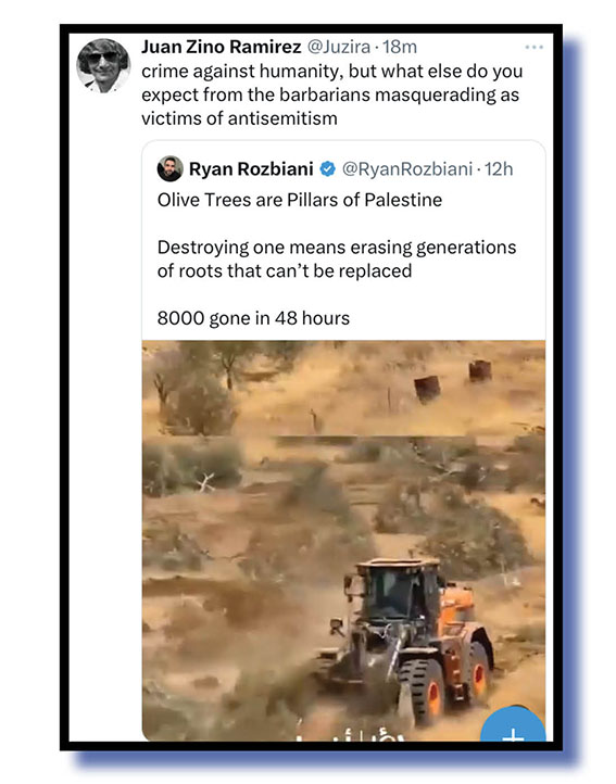 Dr Sheep Person Podge and Samira Mohyeddin also waded in, clearly unmoved by the fact that housing blocks can’t just be plonked on the top of olive trees and even the ones that could have been left standing would have spoilt the views of Israelis as they settled more of their historic and sacred lands.