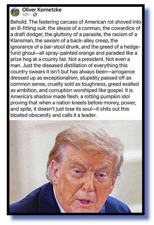 Apologies now for anyone having brekkie, but here’s some more shit dumped on the Orange Oaf from Mike Carlton and Oliver Kornetske. The latter takes some reading but please give his brilliant words a go and then shed a tear for the US.