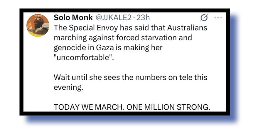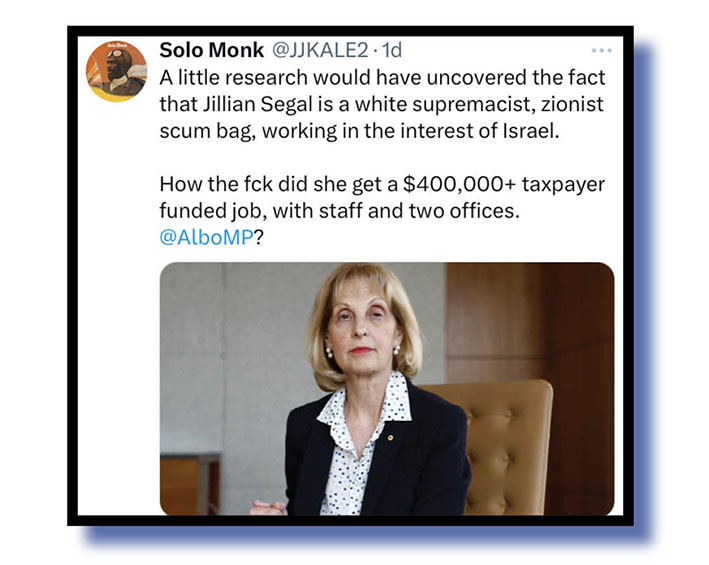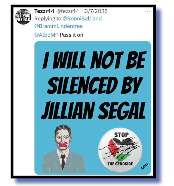 Okay, onto more serious matters. Last weekend’s pro-Palestinian marches sparked fresh outrage over special envoy to foster Zionism – sorry! – to combat anti-semitism Jillian Segal. Here are a double dip from Solo Monk and one from Tezzr44.