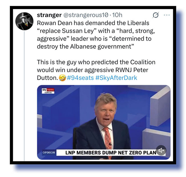 Jeepers creepers! Could Rowan Dean, pictured below, be Right on at least one thing? That Ley has to go ASAP and be replaced by a RWNJ like Andrew Hastie if the Liberals want to have any hope at all of staying in opposition for, say, another two, three of more terms?