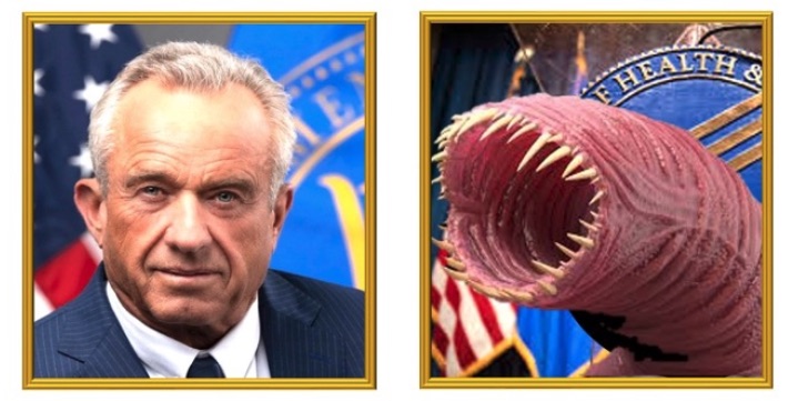 Mr Kennedy (far right at left below) said he would seek urgent congressional confirmation of his own invasive brain worm (at right below) as the permanent CDC director.