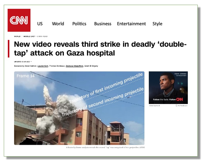 US news organisation CNN has reported that an analysis of video footage taken at the Gaza hospital hit by Israeli Defence Force projectiles reveals a first strike followed by two successive strikes once first responders and media representatives were on site (below)