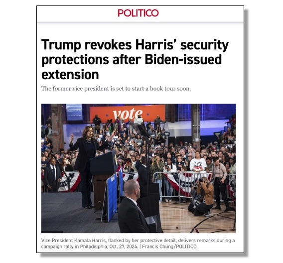 The White House has announced Mr Trump’s decision to scrap a six-month extension of Ms Harris’s personal security previously approved by former President Joe Biden. (below)