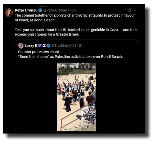 We’re talking the weekend, of course, when Palestinian supporters objecting to the ongoing Israeli genocide in Gaza met quite unfriendly ire from racists, zionists and assorted brain-dead yobbos.