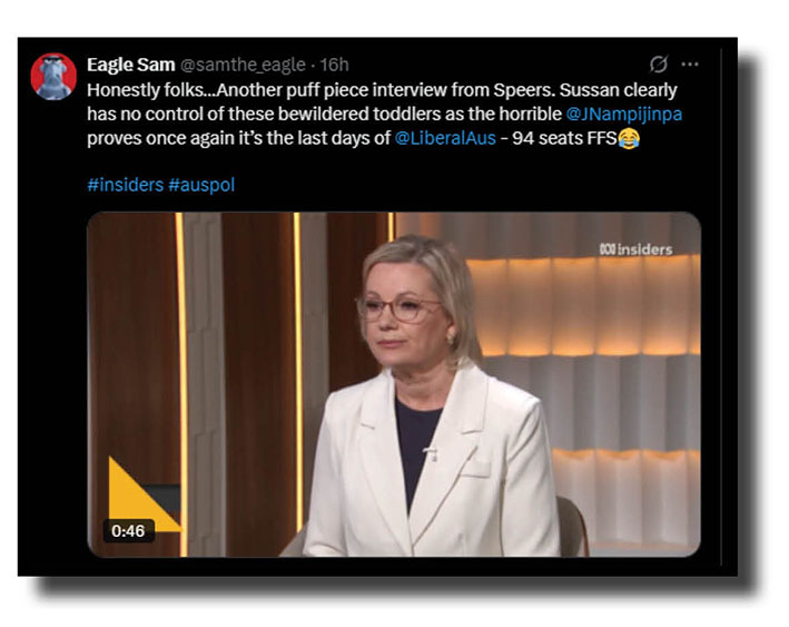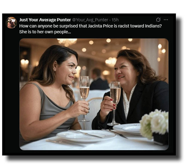 We’re talking, of course, of Jacinta Price, whom Just Your Average Punter (at top and below) reinforced our own views of this wretched piece of work. You can often tell a person’s character by the company they keep, right? And Jacinta “the mob is strongly opposed to the Voice” Price looks relaxed and comfortable in the company of the daughter of a bloke had a final solution to problems he was having with darkies.