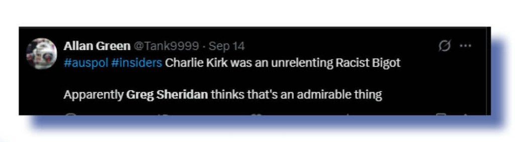 Let’s hear first from Julian Andrew, Sleeping Giants Oz, Allan Green, Tim Duncan and Matt Martin on Henderson’s uncanny ability to decide who is, and who isn’t, racist and what a swell guy Charlie Kirk was!