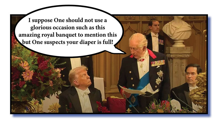 Using the latest advances in Artificial Intelligence and pinpoint audio technology, all enhanced by our own in-house tech wizznerds, The Bug proudly presents a series of special moments from the Royal Banquet put on by the King of Australia for US President Donald Trump in London overnight.