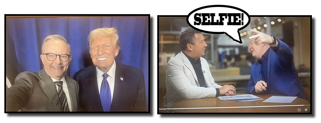 EDITOR’S COMMENTS: I’m just so proud of the way Australia’s best and most cutting satirists sprang into action last week when the Albanese/Trump selfie first appeared. One of our most senior humorists – the staffer who regularly monitors Nine News Queensland for bloopers and who holds the record of 28 seconds for downing a 750ml bottle of Bundaberg rum while forced to go through the pain of doing that research – made the Trivago connection immediately but before he could even shout that out, a number of his colleague had already gathered by the main drinks fridge to plot the best way of taking the piss out of both the fridge and the selfie.