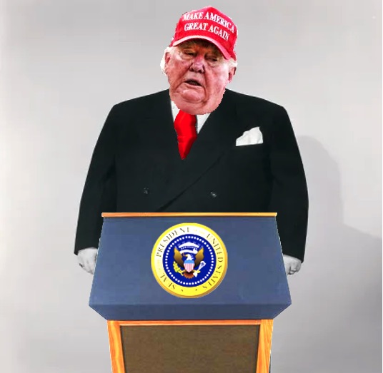 Immediately following Mr Hegseth’s speech, President Trump waddled on stage, one tiny hand nervously patting behind his back to make sure his diaper wasn’t too full, and spoke to the assembled military leaders as their Commander-in-Chief. (main picture)