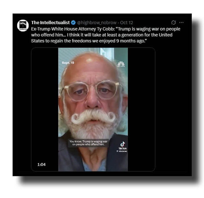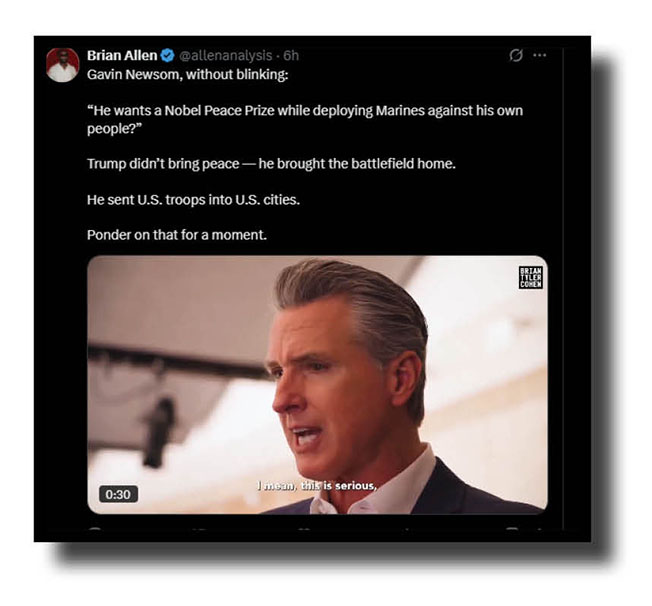 Of course, the Board of Peace chairman is not working his bloated orange arse off only in the Middle East to shore up the inevitability he’ll win next year’s Nobel peace prize – the first of many – but he’s been showing his peace-making skills at home too. Right, Brian Allen and The Intellectualist?