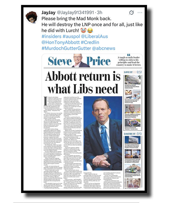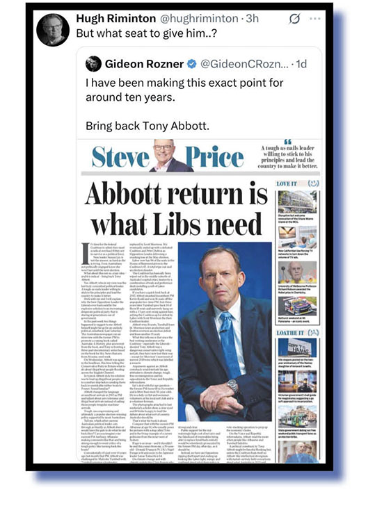 Yes, we know. WE KNOW! Wouldn’t it be great to have the Mad Monk and his red budgie-smugglers back in the game! Especially if Peta Credlin could come back as his chief-of-staff. We can almost hear Niki Savva pondering what to call her book on their second tilt at grateness.