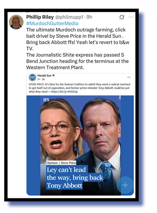 Apart from Price’s risible load of rubbish, the infighting within the Liberal Party stumbled on, and let’s give Phillip Riley a second dump with a comment on how much trouble the grand old party is when they roll out you know who….