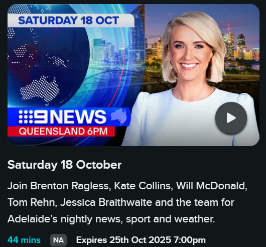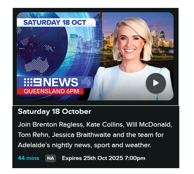 That’s right, BUGgers. The pisstake we took yesterday was that 9Now’s Nine News Queensland links all give the network’s Adelaide news team a big plug! Poor Mia, Poor Melissa Downes, poor Joel Dry, poor Lilly the Pink the Pink Greer, poor Garry Youngberry, poor Tim Arvier if he had still been there, etc, etc.