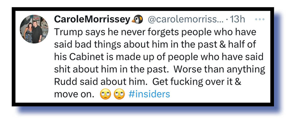 The Bug’s Terry Sweetman (top and below) with his view on what Trump had to say about our Ambassador Kevin Rudd at that meeting.