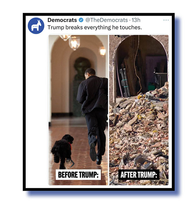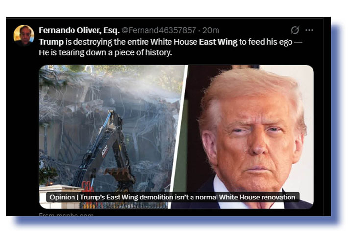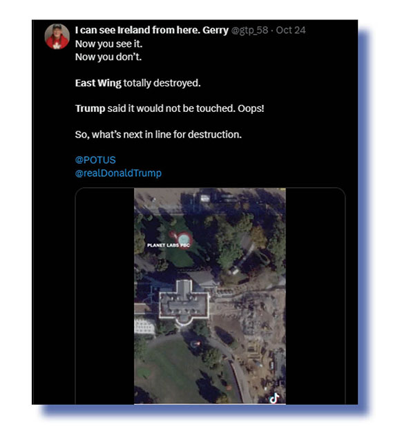 And on the destruction of the East Wing let’s see what faecal flak Democrats, Fernando Oliver Esq and I Can See Ireland from here. Gerry sent Trump’s way.