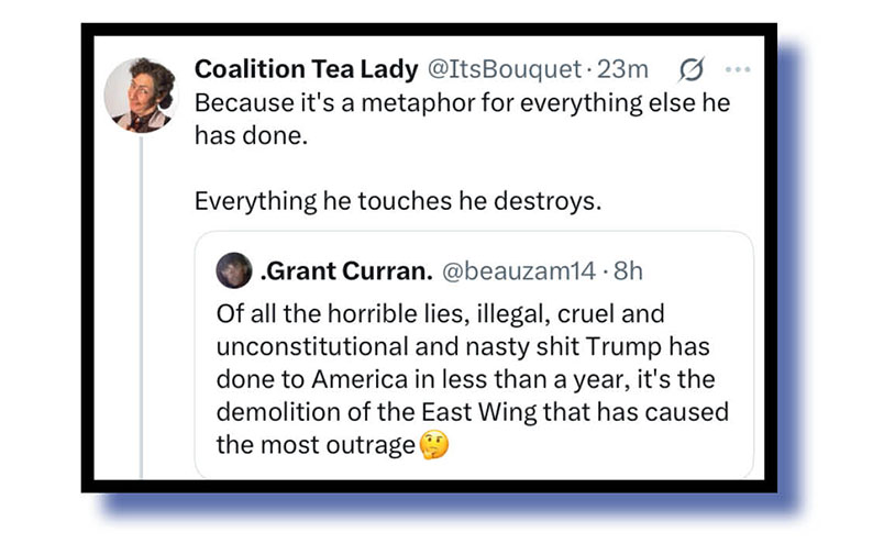 Another Xer we should have run earlier was our dear friend Coalition Tea Lady, voiding on the destruction of the White House’s East Wing.