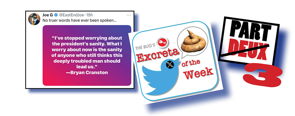 We hadn’t planned a third look at our Xcrements-of-the-Week but a few incidents earlier in this new week changed our minds. And, yes, we offer our usual apology for anyone still having breakfast as this tranche centres around you-know-who smells and lies a lot.
