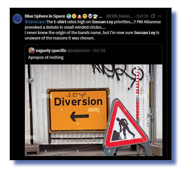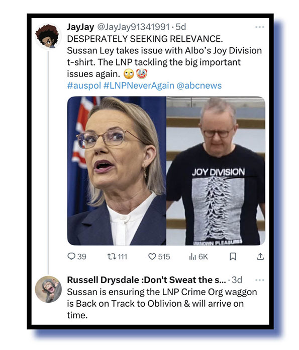 Yes, Susssan Ley’s attempts to smear PM Albanese as anti-semite for wearing a music T-shirt certainly drew the attention of our XOTW judges, unable to avoid the stench of the mountain of excrement that plopped into our prize barrel on this one issue alone.