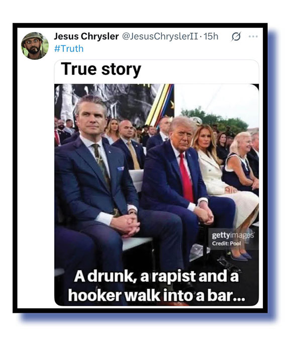 Yes, the true story is that it’s only the first line of a joke but we still think it’s funny. It will be even funnier if Trump and his missus and the Minister for War sue us for a billion dollars for defaming them. If they made it $10 we might just be able to rustle up payment.