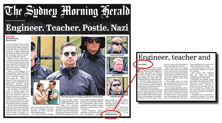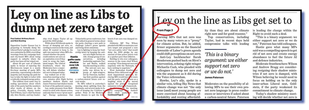 We know, BUGgers, we know! With today’s (Thursday’s) edition of the SMH having a Hardly Normal adverting wraparound, we assume two subs (we’re going to say two because it makes our victory even sweeter) had two stories continued over from the fake SMH cover as coming from PAGE THREE, because that’s where it fucking well came from! Not page 1! Not the front page! Not the cover page.